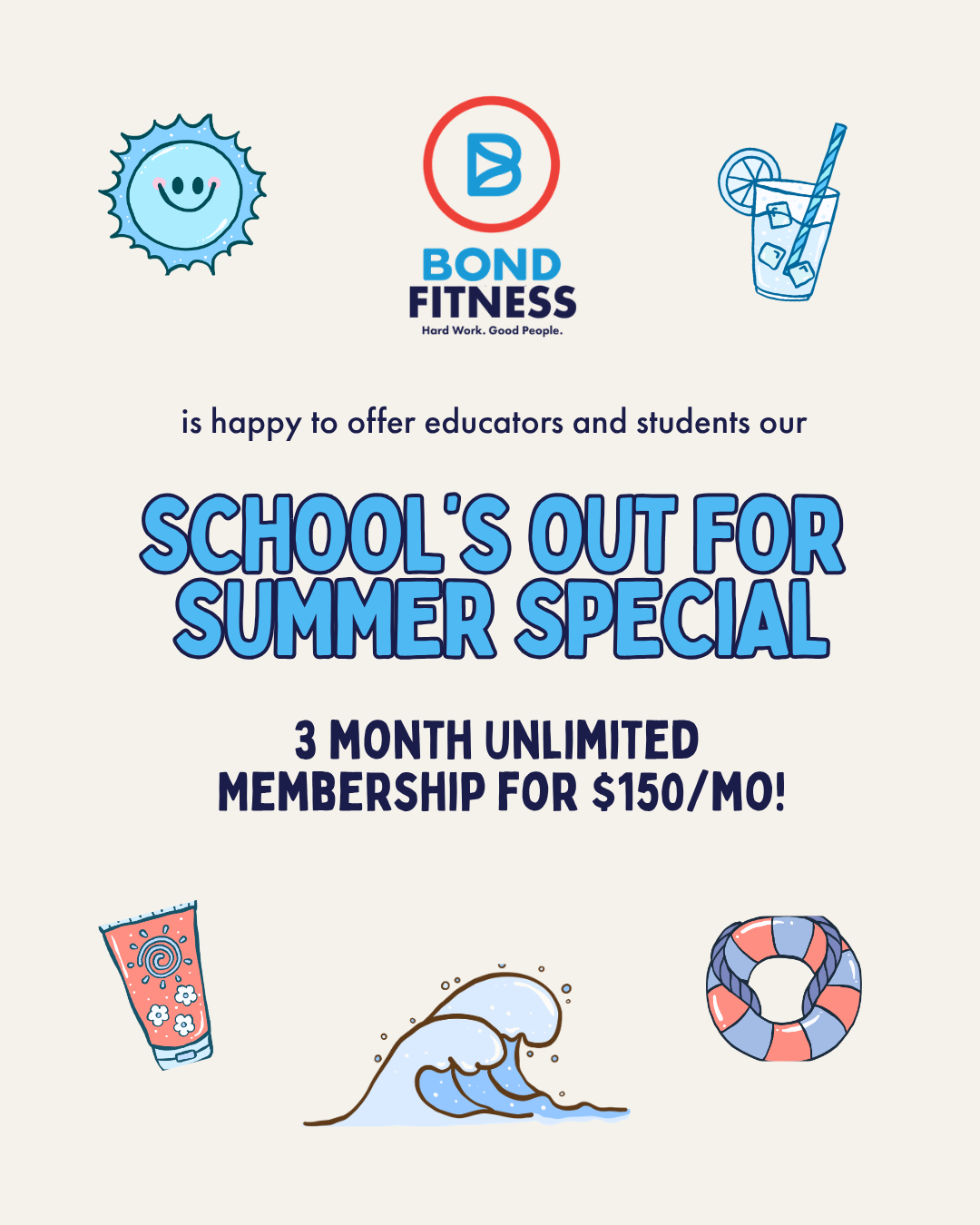 We’re offering educators and students a special summer membership - 3 Unlimited Months for $150/mo. Email us at info@bondfitness.com to get started.